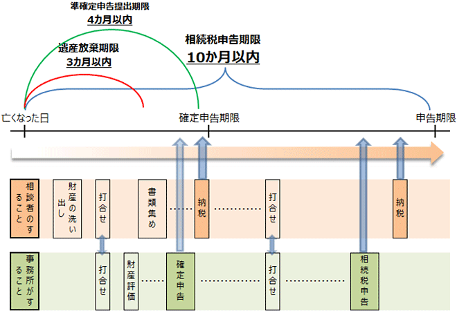 相続税の申告は、「亡くなった日の翌日から10月以内」に行わなければなりません。また、相続税の申告における大まかなスケジュールは下記の図となります。